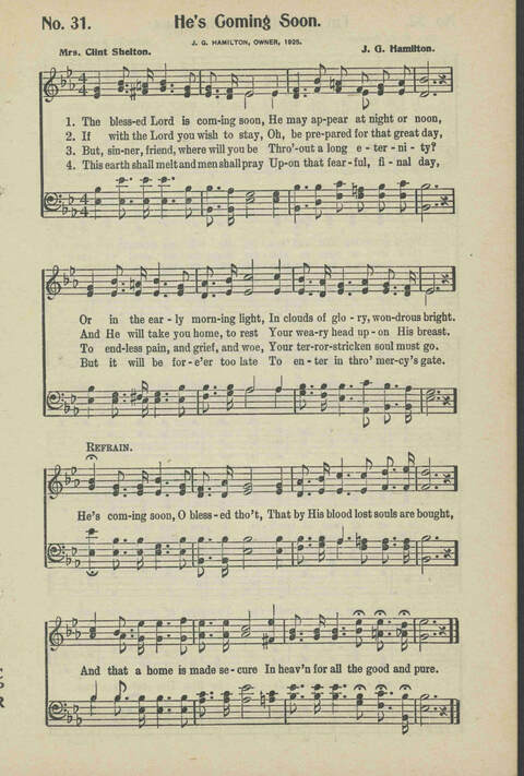 | Refrain First Line: | He's coming soon, O blessed tho't |