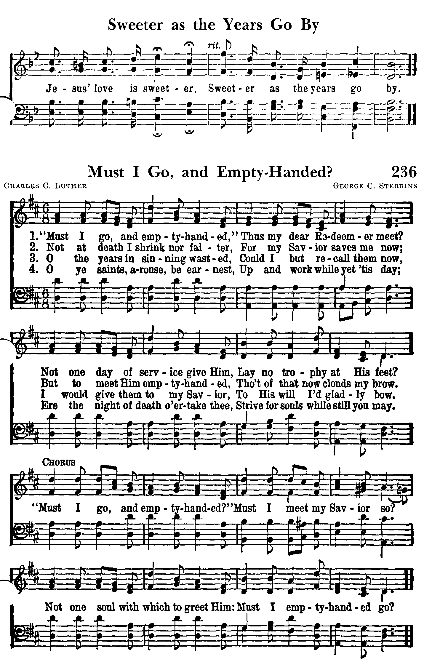 | Tune: | ["Must I go, and empty-handed"] |