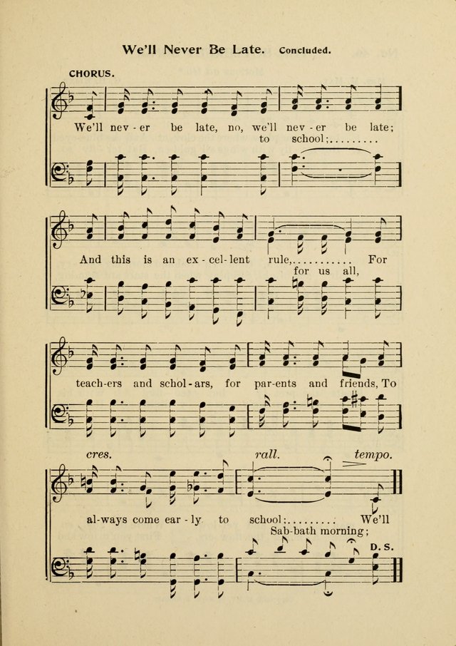 | First Line: | We'll never be late to Sabbath school |