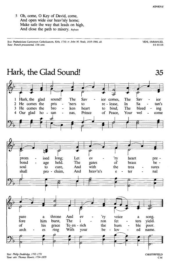 | First Line: | Hark, the glad sound! The Savior comes |