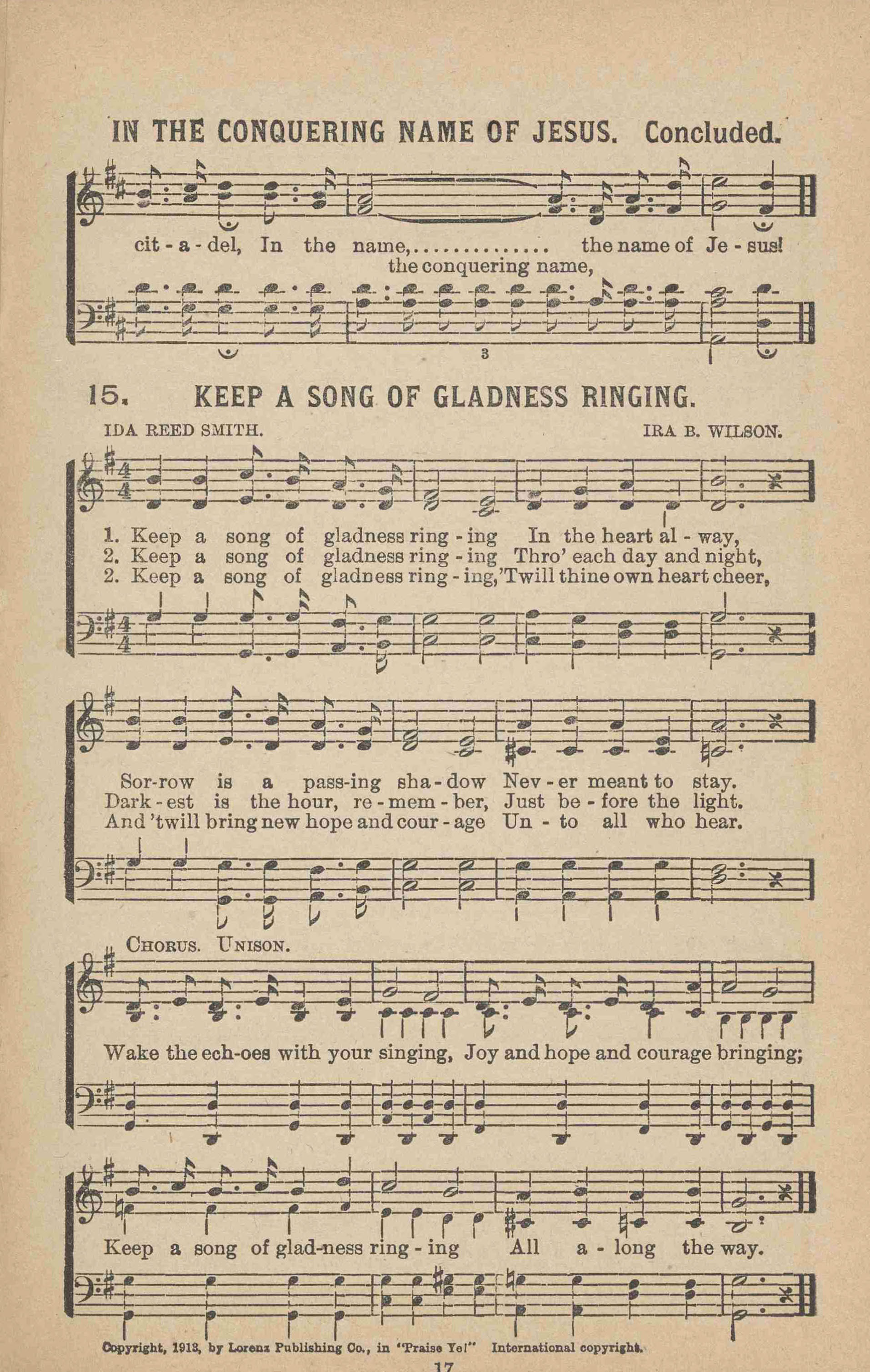 | Tune: | [Keep a song of gladness ringing] |