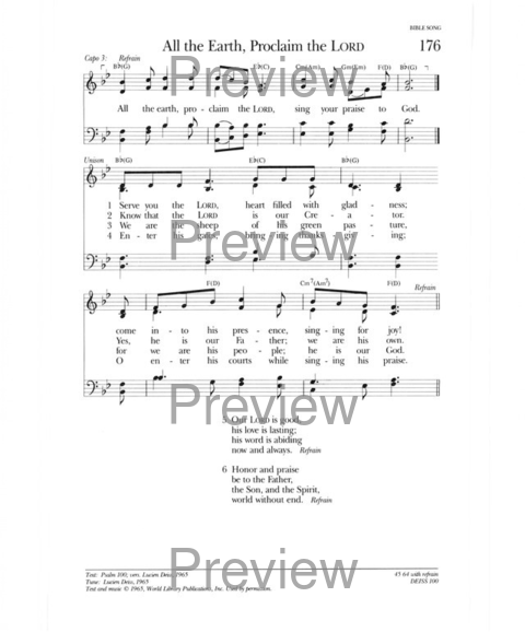 This lively setting of Psalm 100 was composed by Lucien A. Deiss (b. Paris, France, 1921), a missionary, biblical scholar, liturgical expert, hymn writer, and composer who is recognized worldwide for his leadership in biblical studies and the renewal of worship. He was in the forefront of the movement in the Roman Catholic Church to sing congregation ally in the vernacular. "All the Earth" is one of Deiss's most effective settings and has gained popularity far beyond its original Roman Catholic context. It was first published in French in Sur la lyre a dix cordes (1952); the English version was published in volume 1 of Biblical Hymns and Psalms. The refrain comes from Psalm 100: 1, stanzas 1 through 5 cover the rest of the psalm, and stanza 6 is the customary trinitarian doxolo¬gy (see PHH 246 for a brief explanation of trinitarian structure). See PHH 100 for textual commentary on Psalm 100.