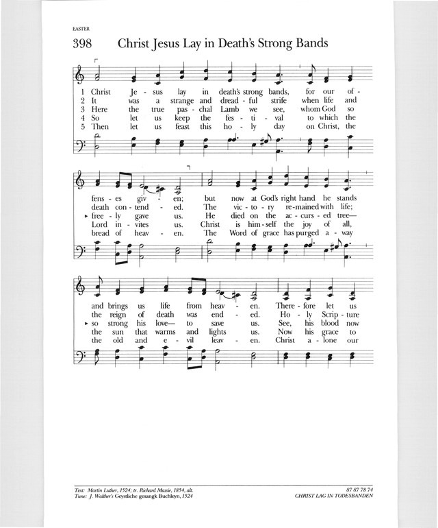 One of the earliest and best-known Lutheran chorales, CHRIST LAG IN TODESBANDEN is a magnificent tune in rounded bar form (AABA) with vigor and lightness characteristic of Easter carols. Many organ compositions are based on this tune; Johann S. Bach (PHH 7) incorporated it extensively in his cantatas 4 and 158.