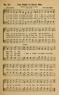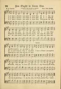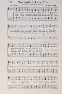 Author: H. O. Devah Hymnal: Glory Songs #120 (1907) First Line: I have a Friend—you ought to know Him Refrain First Line: I have a Friend—you ought to know Him Languages: English Tune Title: [I have a Friend—you ought to know Him]