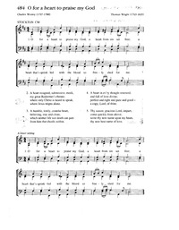 Author: Charles Wesley Hymnal: The Cyber Hymnal #4817 Meter: 8.6.8.6 Lyrics: 1. O for a heart to praise my God,