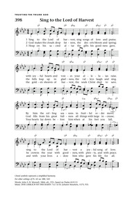 Author: John Samuel Bewley Monsell Hymnal: Voices United #519 (1996) Meter: 7.6.7.6 D Lyrics: 1 Sing to the Lord of harvest, sing songs of love and praise, with joyful hearts and voices your hallelujahs raise; by whom the rolling seasons in fruitful order move; sing to the Lord of harvest a joyous song of love. 2 God makes the clouds drop fatness, the deserts bloom and spring, the hills leap up in gladness, the valleys laugh and sing. God fills them all with fullness, all things with large increase; and crowns the year with goodness, with plenty and with peace. 3 Bring to this sacred altar all things God's goodness gave, the golden sheaves of harvest, the souls Christ died to save: your hearts lay down before him when at his feet you fall, and with your lives adore him who gave his life for all. Topics: The Church at Worship Special Days, Seasons, Occasions: Thanksgiving; God Providence; Harvest; Music and Singing; Rural Life; Salvation; Thankfulness; Thankfulness; Thanksgiving Day; Thanksgiving Year A; Thanksgiving Year B; Thanksgiving Year C Languages: English Tune Title: WIE LIEBLICH IST DER MAIEN