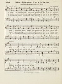 Author: E. A. Hoffman Hymnal: The Majestic Hymnal, number two #199 (1959) First Line: What a fellowship, what a joy divine Refrain First Line: Leaning, leaning Topics: Fellowship; The Christian Dependence; Fellowship; The Christian Dependence Languages: English Tune Title: [What a fellowship, what a joy divine]
