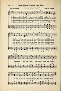Just when I need Him most. Topics: Burdens; Comfort; God His Faithfulness; Guidance; Jesus Christ His Love and Mercy; Prayer and Intercession Scripture: Philippians 4:19 Languages: English Tune Title: GABRIEL