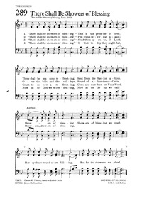 Author: El Nathan Hymnal: The New Church Hymnal #393 (1976) First Line: "There shall be showers of blessing Refrain First Line: Showers of blessing, Showers of blessing we need Lyrics: 1 “There shall be showers of blessing:”This is the promise of love;There shall be seasons refreshing, Sent from the Saviour above. Refrain:Showers of blessing, Showers of blessing we needMercy-drops round us are falling, But for the showers we plead. 2 “There shall be showers of blessing:”Precious reviving again; Over the hills and the valleys, Sound of abundance of rain. [Refrain] 3 “There shall be showers of blessing:”Send them upon us, O Lord;Grant to us now a refreshing,Come, and now honor Thy Word. [Refrain] 4 “There shall be showers of blessing:”Oh, that today they might fall, Now as to God we're confessing, Now as on Jesus we call! [Refrain] Topics: The Christian Life Grace and Mercy; Joy; Thankfulness Languages: English Tune Title: ["There shall be showers of blessing]