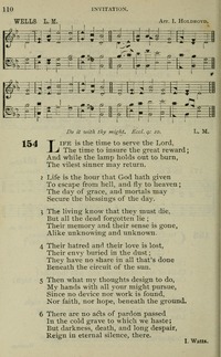 Author: Isaac Watts (1674-1748)Hymnal: Songs of Praise with Tunes #198 (1889)First Line: Life is the time to serve the LordTopics: Delay Danger of; Life Object ofScripture: Ecclesiastes 9:10Tune Title: WELLS