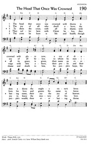 Author: Thomas Kelly Hymnal: Voices United #190 (1996) Meter: 8.6.8.6 Topics: The Christian Year Ascension; Christian Year Ascension; Healing; Heaven(s)/Paradise; Hope; Jesus Christ Atonement; Jesus Christ Cross; Jesus Christ Kingship, Conqueror; Jesus Christ name; Joy; Suffering; Unity; Victory; Wholeness; Christmas 1 Year A; Christmas 1 Year A; Easter 1 Year A; Easter 3 Year A; Lent 5 Year B; Easter 3 Year B; Easter 6 Year B; Easter 7 Year B; Proper 15 Year B; Proper 22 Year B; Proper 24 Year B; Proper 28 Year B; Epiphany 7 Year C; Easter 2 Year C; Proper 23 Year C; Ash Wednesday Year ABC First Line: The head that once was crowned with thorns Lyrics: 1 The head that once was crowned with thorns is crowned with glory now; a royal diadem adorns the mighty victor’s brow. 2 The joy of all who dwell above, the joy of all below, to whom he manifests his love and grants his name to know. 3 To them the cross with all its shame, with all its grace is given, their name an everlasting name, their joy the joy of heaven. 4 They suffer here with Christ below, they reign with him above, their profit and their joy to know the mystery of his love. 5 The cross he bore is life and health, though shame and death to him, his people's hope, his people's wealth, their everlasting theme. Languages: English Tune Title: ST MAGNUS
