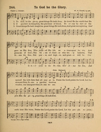 Author: Fanny J. CrosbyHymnal: Select Songs for the Singing Service #244 (1885)First Line: To God be the glory, great things He hath doneRefrain First Line: Praise the Lord, praise the LordLanguages: EnglishTune Title: [To God be the glory, great things He hath done]