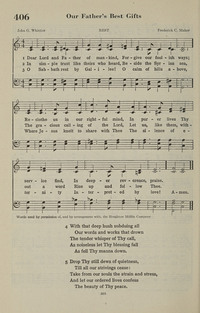Author: John G. Whittier Hymnal: Hymns for the Living Church #407 (1974) Meter: 8.6.8.8.6 Lyrics: 1 Dear Lord and Father of mankind, Forgive our foolish ways! Reclothe us in our rightful mind; In purer lives Thy service find, In deeper rev'rence, praise. 2 In simple trust like theirs who heard, Beside the Syrian Sea, The gracious calling of the Lord, Let us, like them, without a word, Rise up and follow Thee. 3 Drop Thy still dews of quietness, Till all our strivings cease; Take from our souls the strain and stress, And let our ordered lives confess The beauty of Thy peace. 4 Breathe through the heats of our desire Thy coolness and Thy balm; Let sense be dumb, let flesh retire; Speak through the earthquake, wind, and fire, O still small voice of calm! Amen. Topics: Peace Spiritual Scripture: 1 Kings 19:12 Languages: English Tune Title: REST