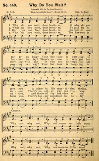 Author: G. F. R.Hymnal: Worship and Service #142 (1916)First Line: Why do you wait, dear brotherTopics: InvitationTune Title: [Why do you wait, dear brother]