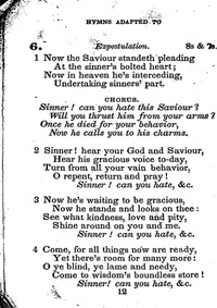 Hymnal: Conference Hymns. a new collection of hymns, designed especially for use in conference and prayer meetings, and family worship. #6 (1849) First Line: Now the Saviour standeth pleading Refrain First Line: Sinner, can you hate this Saviour? Languages: English