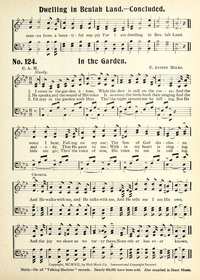 Author: C. A. M.Hymnal: Life and Service Hymns #107 (1917)First Line: I come to the garden aloneRefrain First Line: And he walks with me, and he talks with meTopics: Fellowship; Guidance; Joy; SolosLanguages: EnglishTune Title: [I come to the garden alone]