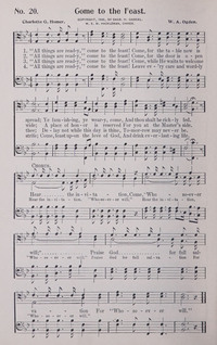 Author: Charlotte G. Homer Hymnal: Christian Hymnal #329 (1963) First Line: "All things are ready," come to the feast! Tune Title: ["All things are ready," come to the feast!]