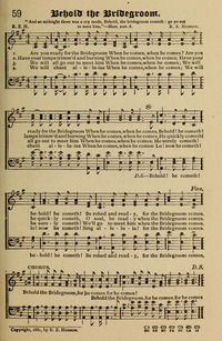 Author: R. E. H.Hymnal: Precious Hymns for Times of Refreshing and Revival #59 (1885)First Line: Are you ready for the BridegroomRefrain First Line: Behold the Bridegroom, for He comes, for He comesTune Title: [Are you ready for the Bridegroom]
