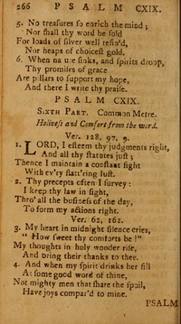 Author: Isaac Watts Hymnal: Psalms and Hymns of Isaac Watts, The #Ps.269 (1806) Meter: 8.6.8.6 First Line: Lord, I esteem thy judgments right Lyrics: Lord, I esteem thy judgments right, And all thy statutes just; Thence I maintain a constant fight With every flatt'ring lust. Thy precepts often I survey; I keep thy law in sight, Through all the business of the day, To form my actions right. My heart in midnight silence cries, "How sweet thy comforts be!" My thoughts in holy wonder rise, And bring their thanks to thee. And when my spirit drinks her fill At some good word of thine, Not mighty men that share the spoil Have joys compared to mine. Topics: Meditation; Counsel and support from God; Midnight thoughts; Scripture holiness and comfort from it Scripture: Psalm 119 Languages: English