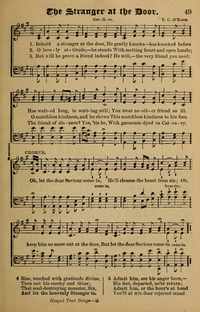 Hymnal: Gospel Tent Songs #49 (1903) First Line: Behold a Stranger at the door Refrain First Line: Oh, let the dear Saviour come in Languages: English Tune Title: [Behold a Stranger at the door]