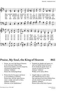 Author: Henry F. Lyte, 1793-1847 Hymnal: Evangelical Lutheran Worship #865 (2006) Meter: 8.7.8.7.8.7 Lyrics: 1 Praise, my soul, the King of heaven; to his feet your tribute bring. Ransomed, healed, restored, forgiven, evermore his praises sing. Alleluia! Alleluia! Praise the everlasting King! 2 Praise him for grace and favor to our forebears in distress. Praise him, still the same forever, slow to chide and swift to bless. Alleluia! Alleluia! Glorious in his faithfulness! 3 Tenderly he shields and spares us; well our feeble frame he knows. In his hands he gently bears us, rescues us from all our foes. Alleluia! Alleluia! Widely as his mercy flows. 4 Angels help us to adore him, who behold him face to face. Sun and moon bow down before him; all who dwell in time and space. Alleluia! Alleluia! Praise with us the God of grace. Topics: Praise, Thanksgiving; Praise, Thanksgiving Languages: English Tune Title: PRAISE, MY SOUL