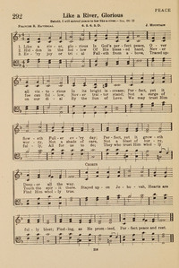 Author: Frances R. HavergalHymnal: Church Hymnal, Mennonite #292 (1927)Meter: 6.5.6.5 DFirst Line: Like a river, glorious Is God's perfect peaceRefrain First Line: Stayed upon JehovahScripture: Isaiah 66:12Languages: EnglishTune Title: [Like a river, glorious]