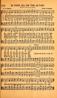 Author: E. A. HoffmanHymnal: Songs of Summerland #210 (1943)First Line: You have longed for sweet peace, and for faith to increaseRefrain First Line: Is your all on the altar of sacrifice laid?Languages: EnglishTune Title: [You have longed for sweet peace, and for faith to increase]