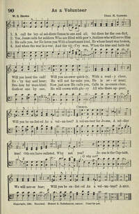 Author: W. S. BrownHymnal: Abiding Songs #90 (1936)First Line: A call for loyal soldiersRefrain First Line: A volunteer for JesusLanguages: EnglishTune Title: [A call for loyal soldiers]
