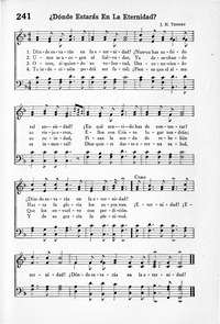 Hymnal: Himnos de la Vida Cristiana #241 (1939) First Line: Dónde estarás en la eternidad! Refrain First Line: ¡Eternidad! Languages: Spanish Tune Title: [Dónde estarás en la eternidad!]