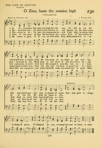 Author: Mrs. Mary Ann ThomsonHymnal: The Smaller Hymnal #211 (1928)First Line: O Zion, haste, thy mission high fulfillingLanguages: EnglishTune Title: ANGELIC SONGS