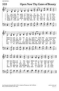 Author: Bejamin Schmolck, 1672-1737; Catherine Winkworth, 1827-1878 Hymnal: Evangelical Lutheran Worship #533 (2006) Meter: 8.7.8.7.7.7 Lyrics: 1 Open now thy gates of beauty, Zion, let me enter there, where my soul in joyful duty waits for God who answers prayer. Oh, how blessed is this place, filled with solace, light, and grace! 2 Gracious God, I come before thee; come thou also unto me; where we find thee and adore thee, there a heav'n on earth must be. To my heart, oh, enter thou, let it be thy temple now! 3 Here thy praise is gladly chanted, here thy seed is duly sown; let my soul, where it is planted, bring forth precious sheaves alone, so that all I hear may be fruitful unto life in me. 4 Thou my faith increase and quicken, let me keep thy gift divine; howsoe'er temptations thicken, may thy word still o'er me shine as my guiding star through life, as my comfort in all strife. 5 Speak, O God, and I will hear thee, let thy will be done indeed; may I undisturbed draw near thee while thou dost thy people feed. Here of life the fountain flows; here is balm for all our woes. Topics: Dedication, Anniversary; Gathering; Dedication, Anniversary; Gathering; Word of God Languages: English Tune Title: UNSER HERRSCHER