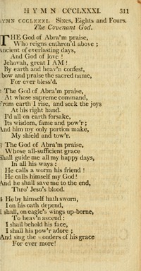 Author: Thomas Olivers, 1725-1799 Hymnal: The Hymnal 1982 #401 (1985) Meter: 6.6.8.4 D Lyrics: 1 The God of Abraham praise, who reigns enthroned above; Ancient of everlasting days, and God of love; the Lord, the great I AM, by earth and heaven confessed: we bow and bless the sacred Name for ever blest. 2 He by himself hath sworn: we on his oath depend; we shall, on eagles-wings upborne, to heaven ascend: we shall behold his face, we shall his power adore, and sing the wonders of his grace for evermore. 3 There dwells the Lord, our King, the Lord, our Righteousness, triumphant o'er the world and sin, the Prince of Peace; on Zion's sacred height his kingdom he maintains, and, glorious with his saints in light, for ever reigns. 4 The God who reigns on high the great archangels sing, and “Holy, holy, holy,” cry, “Almighty King! Who was, and is, the same, and evermore shall be: eternal Father, great I AM, we worship thee.” 5 The whole triumphant host give thanks to God on high; “Hail, Father, Son, and Holy Ghost” they ever cry; hail, Abraham’s Lord divine! With heaven our songs we raise; all might and majesty are thine, and endless praise. Topics: Praise to God Languages: English Tune Title: LEONI