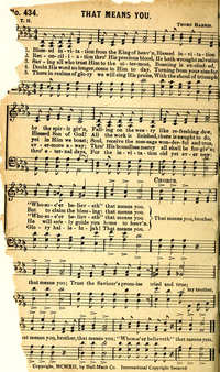 Author: T. H.Hymnal: Rose of Sharon Hymns #434 (1917)First Line: Blessed invitation from the King of heav'nRefrain First Line: That means you, brother, that means youLanguages: EnglishTune Title: [Blessed invitation from the King of heav'n]