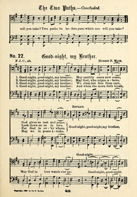 Author: F. J. C. H. Hymnal: Male Chorus No. 2 #48 (1898) First Line: Goodnight, goodnight, my brother Refrain First Line: Goodnight, goodnight, my brother Languages: English Tune Title: [Goodnight, goodnight, my brother]
