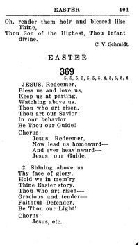 Author: Walter E. Schuette Hymnal: Hymnal for Church and Home (2nd ed.) #369 (1928) Meter: 5.5.5.5.5.5.5.4.5.5.5.4 Lyrics: 1 Jesus, Redeemer, Bless us and love us, Keep us at parting Watching above us. Thou who art risen, Thou art our Savior: In our behavior Be Thou our Guide! Chorus: Jesus, Redeemer, Now lead us homeward-- And ever heav'nward-- Jesus, our Guide. 2 Shining above us Thy face of glory, Hold we in mem'ry Thine Easter story. Thou who art risen-- Gracious and tender-- Faithful Defender, Be Thou our Light! [Chorus] 3 Lift on us, Lord, Thy countenance glorious, Valiant in battle, Captain victorious. Thou who art risen, All things possessing, Grant us Thy blessing, Be Thou our Peace! [Chorus] Topics: Sunday School Hymns Easter Languages: English Tune Title: [Jesus, Redeemer]
