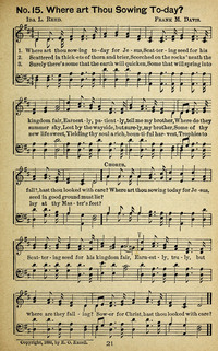 Author: Ida L. Reed Hymnal: Triumphant Songs No.3 #15 (1892) First Line: Where art thou sowing today for Jesus Lyrics: 1 Where art thou sowing today for Jesus,