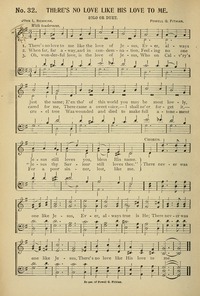Author: John L. Newkirk Hymnal: Zion's Praises (1st ed.) #20 (1903) First Line: There's no love to me like the love of Jesus Refrain First Line: There never was one like Jesus Languages: English Tune Title: [There's no love to me like the love of Jesus]