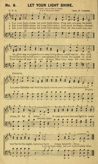 Author: C. H. G. Hymnal: The King of Kings #14 (1915) First Line: Let your light shine, let your light shine Refrain First Line: Let your light shine out ‘mid the darkness on your journey Lyrics: 1 Let your light shine, let your light shine,