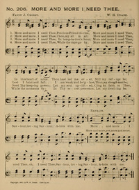 Author: Frances Jane (Fanny) Crosby Hymnal: The Cyber Hymnal #11600 Refrain First Line: More and more Lyrics: 1 More and more I need Thee,