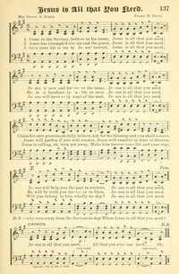 Author: Mrs. Frank A. Breck Hymnal: Songs of Love and Praise No. 4 #191 (1897) First Line: Come to the Saviour, believe in his name Lyrics: 1 Come to the Saviour, believe in his name, Jesus is all that you need; Jesus is now and forever the same, Jesus is all that you need. Claim his sure promise, oh, fully believe, Ask for his blessing and you shall receive, Jesus will help you the past to retrieve, Jesus is all that you need. Refrain: Jesus is all that you need, All that you ever can need; Oh, why turn away from the Saviour today, When Jesus is all that you need? 2 Jesus has triumph’d o’er sin and the grave, Jesus is all that you need; He is abundantly able to save, Jesus is all that you need. Jesus will pardon if you will confess, Jesus will comfort in times of distress, He will be with you forever to bless, Jesus is all that you need. [Refrain] 3 Give your life over to Jesus’ control, Jesus is all that you need; Jesus will meet ev’ry want of the soul, Jesus is all that you need. Jesus is calling, oh, turn not away, Make him forever your life and your stay, Will you belong to him wholly today? Jesus is all that you need. [Refrain] Tune Title: [Come to the Saviour, believe in his name]