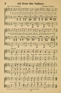 Author: Rev. W. O. CushingHymnal: The New Alleluia #180 (1886)First Line: All over the valleys so green and fairRefrain First Line: He sprinkled the rain from His great white cloudLanguages: EnglishTune Title: [All over the valleys so green and fair]