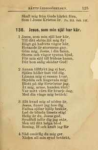 Author: Charles Wesley Hymnal: Lutherförbundets Sångbok #S40 (1913) Meter: 7.7.7.7 D Lyrics: 1 Jesus, som min själ har kär, Till ditt sk¨te låt mig fly! Högt gå hafvets vågot här, Hotande är stormens guy. Göm mig, Jesus, i di famn, Storm och vågor tystna hjud, För min själ till fridens hamn, Där hon salig skådar Gud! 2 Annan tillflykt jag ej har, Själen håller fast vid dig. Lämna mig ej ensam kvar, Skydda och hugsvala mig! Blott på dig förtröstar jag, Åt mig, arme, handen räck! Var mitt värn för hvarje dag, Med din vinge mig betäck! 3 Allt hvad mig af nöden är, Jesus, sinner jag hos dig. Fallna själar hjälp beskär, Led de blinda ljusets stig! Helig är du, Jesus god, Syndfull inför dig jag står, Men uti ditt helga blod Rening, lif och kraft jag får. 4 Nåd omätlig du mig ger, Nåden all min syd betäckt, Nåd jag öfverflöda ser, Nog för fallen mänskosläkt, Du, som lifvets källa var, Är och blir till evig tid, Lif i dig mitt hjärta har, Evig salighet och frid. Topics: Bön; Prayer; Sinnesändring och Tro; Conversion and Faith Languages: Swedish Tune Title: MARTYN