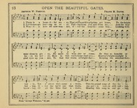 Author: Arthur W. French Appears in 7 hymnals First Line: There is a beautiful story Lyrics: 1 There is a beautiful story, That when earth's pilgrims get home, To the bright mansions in glory, No more to wander or roam; Be they so humble or lowly, Yet a sweet welcome awaits, This the grand song of the holy, Open the beautiful gates, This the grand song of the holy, Open the beautiful gates. Chorus: Open the beautiful gates, Here is a wand'rer that waits, Weary and cold, Out of the fold, Open the beautiful gates. 2 Lov'd ones are leaving us ever, Fading from you and from me, And the dear faces we never, Here in this earth-borne shall see; Heaven's bright sunlight is falling, Over the lov'd one that waits, Angelic voices still calling, Open the beautiful gates, Angelic voices still calling, Open the beautiful gates. [Chorus] 3 Wearily here we now wander, Over the troublesome way, Looking with glad eyes up yonder, To that fair realm of bright day; Keeping the sweetest foreknowing, Of all the bliss that awaits, Hearing this song in our going, Open the beautiful gates, Hearing this song in our going, Open the beautiful gates. [Chorus] Used With Tune: [There is a beautiful story]