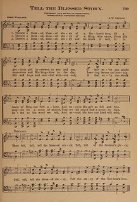 Author: Josie Wallace Hymnal: The Kingdom of Praise #25 (1920) First Line: There's a blessed, blessed story of a Saviour's love Refrain First Line: Then tell, tell, tell the blessed story Lyrics: 1 There’s a blessed, blessed story of a Saviour’s love, Of a precious gift bestowed on you and me, O that ev’ry one might learn of Him, our Gift above, And receive His gift so full and free. Refrain: Then tell, tell, tell the blessed story, Tell, tell of the Saviour’s glory; Tell, tell, tell the blessed story, Tell the story of the Saviour’s love. 2 There’s a blessed, blessed story of a King who came, From His mansions and His kingdom in the sky, Leaving throne and leaving sceptre for a cross of shame, That we all might find a home on high. [Refrain] 3 There’s a blessed, blessed story and we know it well, It is life and hope and comfort without end; O that ev’ry one would listen as the word we tell, And accept the love our Lord will send. [Refrain] Tune Title: [There's a blessed, blessed story of a Saviour's love]