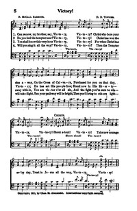 Author: B. McCall Barbour Hymnal: The Voice of Thanksgiving #5 (1913) First Line: Can you now, my brother, say Refrain First Line: Shout aloud! Victory Lyrics: 1 Can you now, my brother, say, Victory, Victory? Christ who bore your sins away, On the Cross of Calvary, Purchased for you on that day, Victory, Victory! Refrain: Shout aloud! Victory! Take new courage every day, Trust in Jesus all the way, Victory, Victory! 2 Do you feel the tempter near? Victory, Victory! Christ has won the Victory; He has set His people free; Stand now in His liberty— Victory, Victory! [Refrain] 3 You shall know this very hour Victory, Victory! For when Christ has sway within, You are victor o’er all sin, And the fight you’re sure to win— Victory, Victory! [Refrain] 4 Will you sing it all the way? Victory, Victory? Then the Tempter will take flight, Then your pathway will be bright, Then you’ll bring to others light— Victory, Victory! [Refrain] Tune Title: [Can you now, my brother, say Victory]