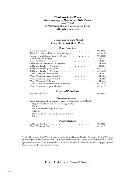 The series of WOOD WORKS FOR ORGAN have long been best sellers, and now the composer has transcribed many of these popular works for piano. The piano settings bear the incomparable imprint of a composer whose hallmark is highly respected throughout the church music circles. Moderately easy, the music is all truly memorable.