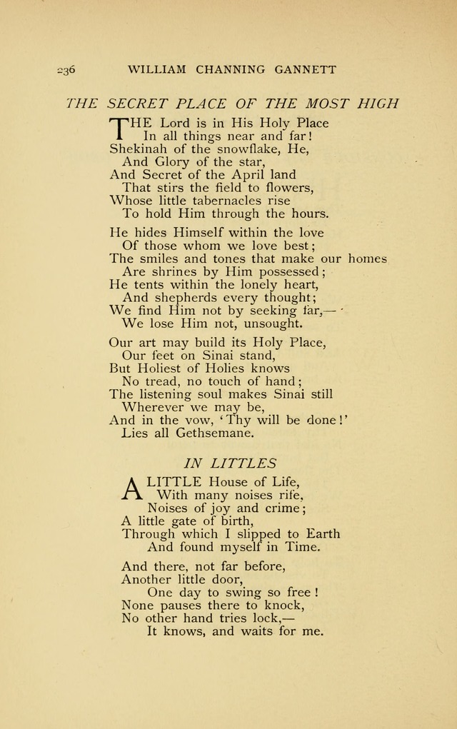 Gannett, William Channing, M.A., s. of Dr. Ezra Stiles Gannett, was b. at Boston, March 13, 1840, and educated at Harvard College, 1860, and the Divinity School, Cambridge. Entered the Unitarian Ministry in 1868, and after filling several pastorates he became Pastor of the Unitarian Church at Rochester, N.Y., 1889. Mr. Gannett's hymns, mainly written for special occasions, were included in great part in The Thought of God in Hymns and Poems, Boston, 1st Series 1885,2nd Series 1894,