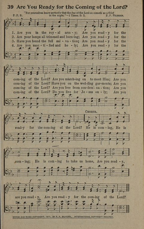 Display Title: Are You Ready For The Coming Of The Lord? First Line: Are you in the royal army? Tune Title: [Are you in the royal army] Author: Peter Philip Bilhorn Source: Hymns of the Second Coming of Our Lord Jesus Christ by Bailie Brown and Peter P. Bilhorn (Chicago: Bilhorn Brothers, 1911)