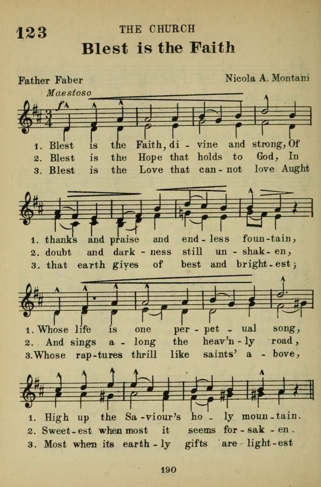Blest is the faith, divine and strong. F. W. Faber. [The Christian Life.] Appeared in his Oratory Hymns, 1854, in 6 stanzas of 4 lines, and the chorus, "O Sion's songs are sweet to sing." In the 1855 edition of the Cooke & Denton Hymnal, it was given with alterations to adapt it for use in the Church of England. In this form it is in a limited number of collections, the original being retained in the Roman Catholic hymnals.