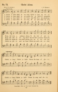 4 Christ alone shall be my song, He my sure foundation; Christ my glory and my hope— Christ my soul’s salvation. [Refrain]Source: The Great Awakening: a choice collection of new and standard gospel songs #72